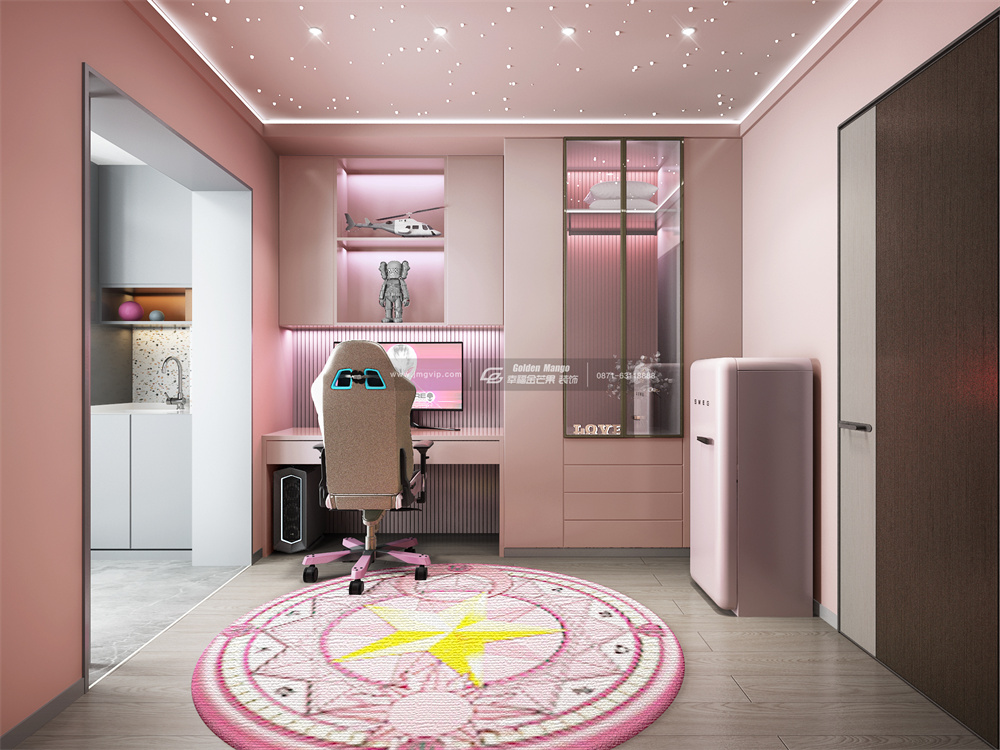 昆明潤城的這套裝修設計比傳統設計多的就是一個電競房的設計,在有限的空間內隔出一個小小的電競房,粉嫩的氣息,燈光閃爍的星空,這小小的一方天地,讓生活具有多面性和趣味性。