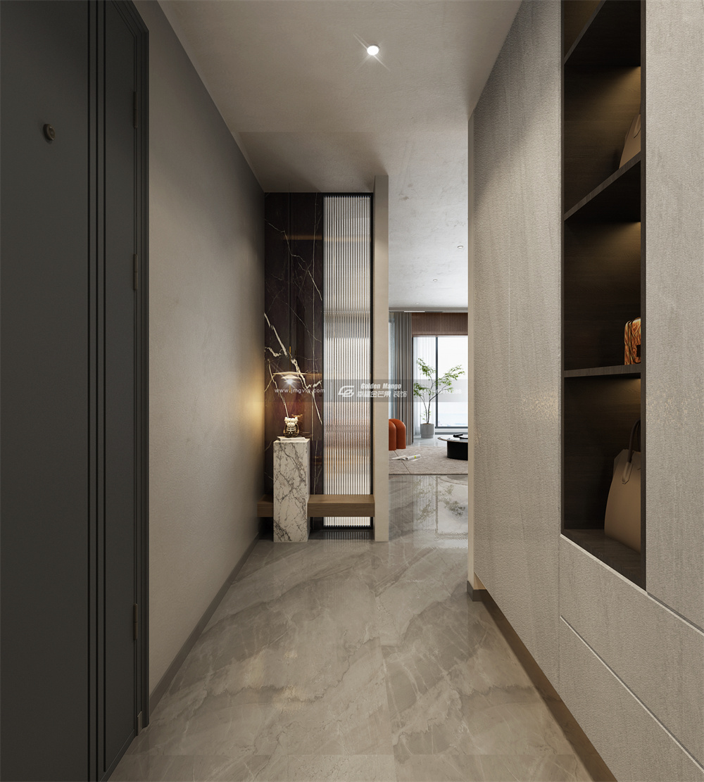 玄關入戶即是白色大理石板面+深色壁龕,設計美觀的同時也兼具收納功能;左側巧用長虹玻璃做隔斷,制造出朦朧的美感,有一種猶抱琵琶半遮面的魅力。