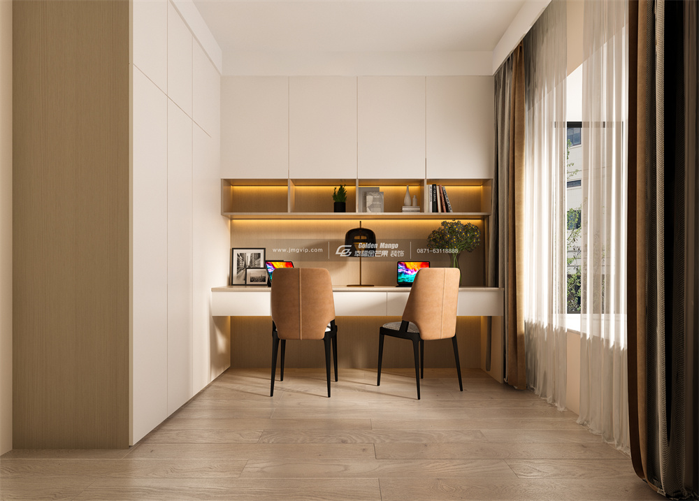充分利用室內空間,在窗邊位置設置懸浮式辦公桌,陽光透過紗簾充盈室內的每一刻,純粹溫暖的柔和感包圍全身,生活的閑適愜意就在這里。