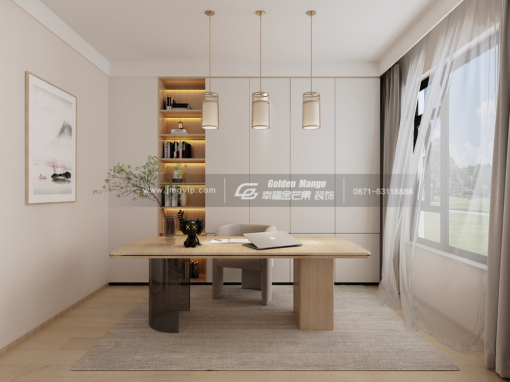 正對客廳的房間設置成書房,工作的沉靜與家居生活的溫馨各成一區,互不干擾;極簡的書房不僅工作,喝茶讀書,靜品時光韻味,浮躁的心情都變得舒緩起來。