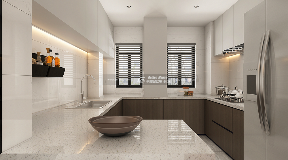 廚房通鋪白色大理石做操作臺面,搭配白色的吊柜,整體明亮通透又整潔,做飯也要有好心情;U型廚房設計,有效利用空間,符合烹飪需求,四方食事在這里展開,煙火人間的生活,與歲月相連。