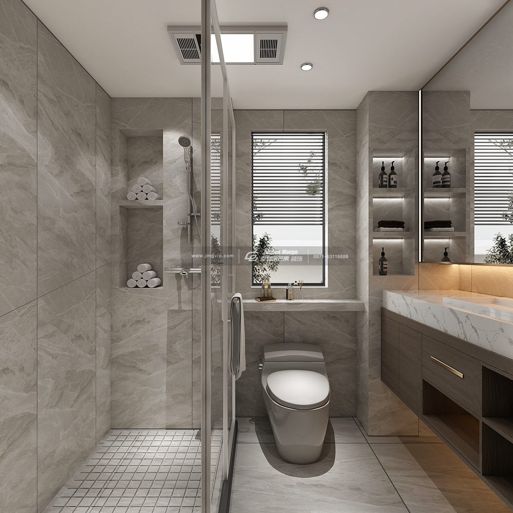 衛生間統一的杏色大理石色調視覺上擴大空間,增加空間的整體性,同時以玻璃隔斷做兩分離,保障衛生間的明亮與通透。