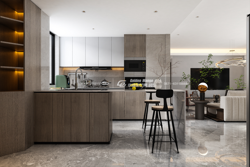 半開放式廚房設計提高了廚房的采光與家居互動性,延伸廚房空間,吧臺與洗菜區相連,既起到劃分空間的作用,又增加了廚房可操作區域,下班后在吧臺小酌一杯或吃點宵夜,釋放一天的疲勞,享受美好瞬間。