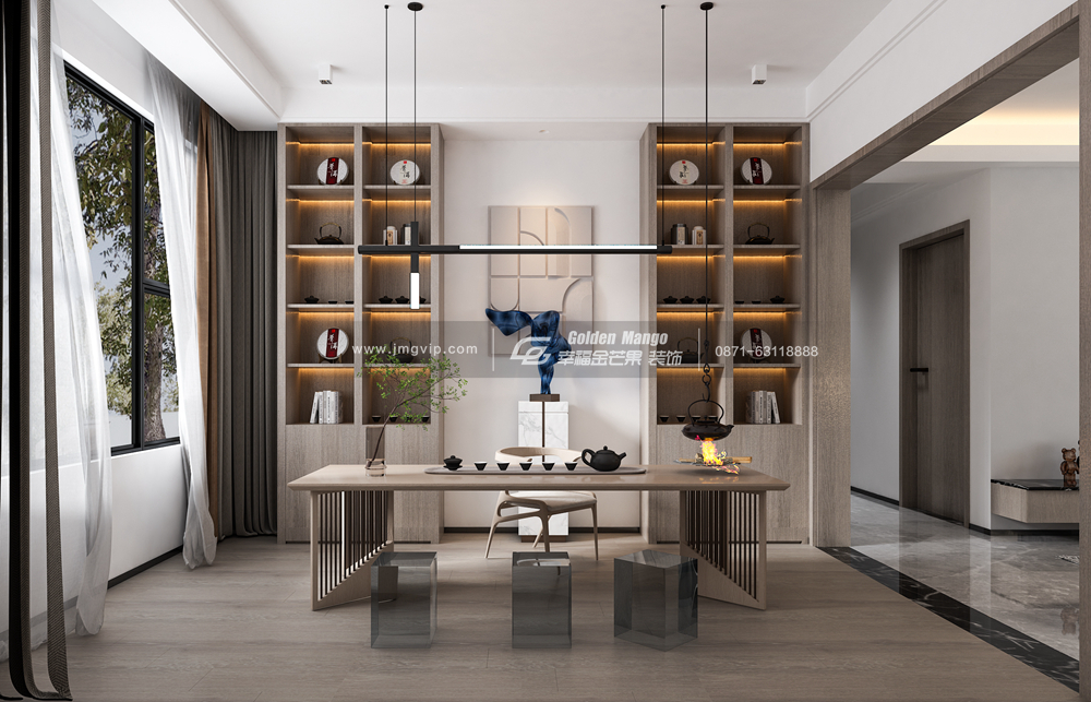 茶室設計以原木風為主,質樸清雅,又處在靠窗的位置,采光、視野極佳,光影穿透進來,整個茶室也如盞中清茶一般,純凈清香,治愈心靈。