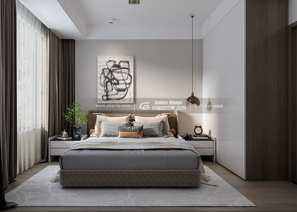 次臥色調深沉,簡約而不簡單,精致又耐看。仿佛這是一個靜者空間,適合深思生活的意義,清逸淡雅,當太陽爬上山崗,自然光透過窗戶洋洋灑灑地照射進來,柔軟又平靜,一派歲月靜好的模樣。