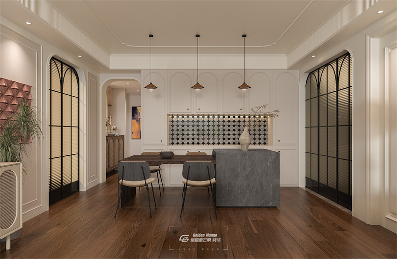 玻璃窗格拱形門搭配經(jīng)典的黑色門框,黑天鵝般的高貴感醞釀出高級(jí)的氛圍。獨(dú)特的藝術(shù)磚塊點(diǎn)綴,復(fù)古的氛圍又加深了幾分。