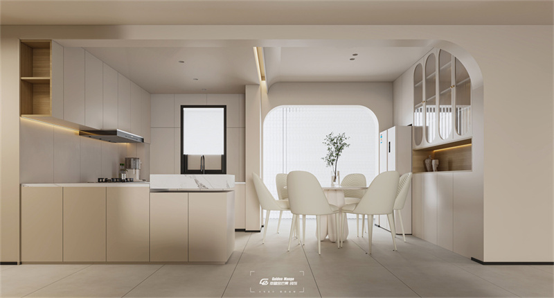 餐廚區(qū)墻頂同色,櫥柜餐桌椅選用了與客餐廳一樣的奶油色系,在視覺(jué)上放大了空間。在空間中大量運(yùn)用曲面的墻體,增強(qiáng)空間的趣味性。