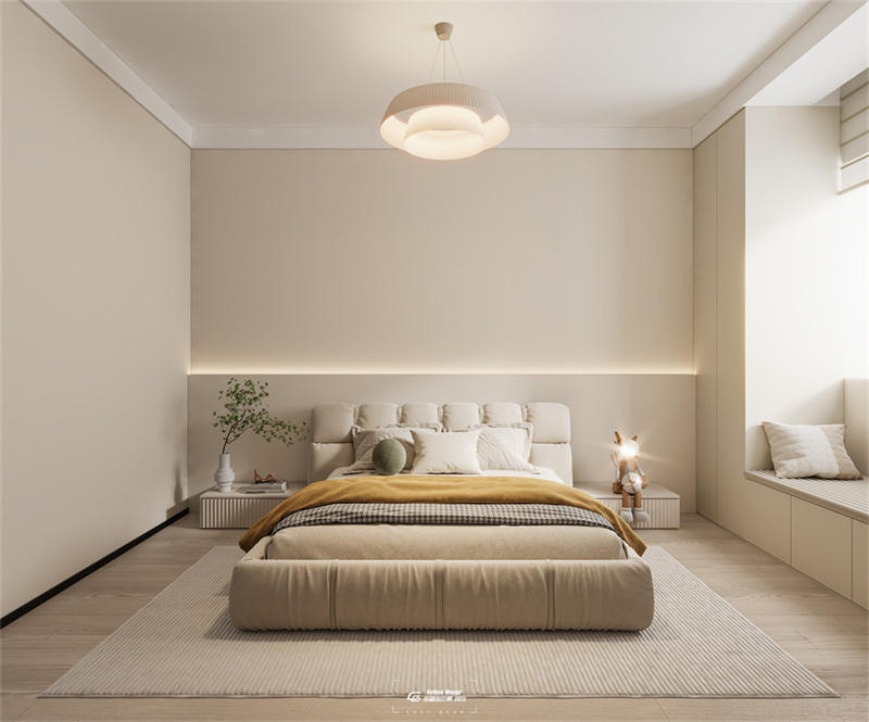主臥依然延續(xù)客餐廳的奶油色,整個(gè)空間靜謐而細(xì)膩。