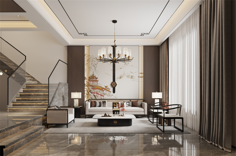 背景墻是大幅的水墨山水傾瀉而下,挑空的設(shè)計(jì)更顯別墅空間的氣勢(shì)恢宏,同時(shí)也彰顯出屋主高瞻遠(yuǎn)矚的生活態(tài)度。一進(jìn)入空間,一番自由大氣的遼闊景象躍然于眼前,提升居住舒適感。
