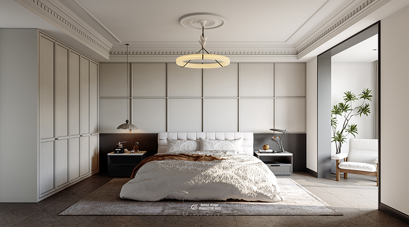 臥室設計同樣別具匠心。床頭背景墻采用白色皮革硬包及金屬扣條裝飾,簡約中透著精致。兩側床頭柜風格迥異,一邊是深色木質柜體搭配金屬臺燈,另一邊則是白色懸空柜搭配簡約燈具,完美詮釋了美式風格的隨性與不羈。