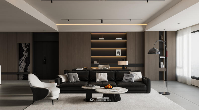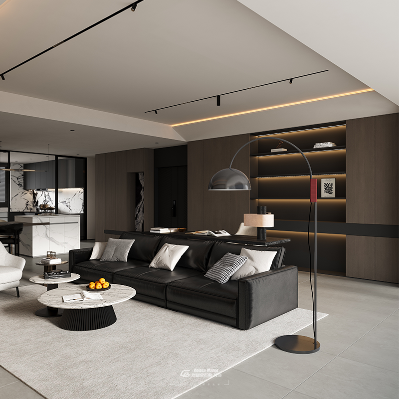 現(xiàn)代簡約風客廳,深木色鋪陳沉穩(wěn)基調(diào),黑皮沙發(fā)與淺調(diào)單椅碰撞質(zhì)感,圓形大理石茶幾串聯(lián)空間韻律。背景墻嵌入燈帶,落地燈弧影搖曳,明暗間,陳列架上的器物悄然訴說秩序與格調(diào)。