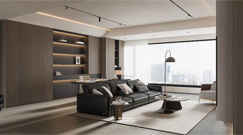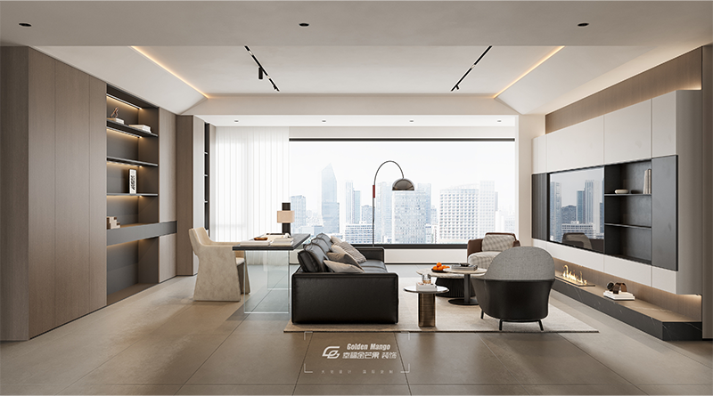 落地窗如巨幕框定城市天際線,現(xiàn)代客廳在硬朗與溫潤間游走。