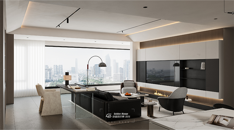 黑色皮沙發(fā)呼應壁爐星火,異型單椅、玻璃支腳案臺拆解厚重,線性燈暈漫過墻面。材質(zhì)碰撞間,開闊視野與精致細節(jié)交融,織就都市棲居的從容韻律。