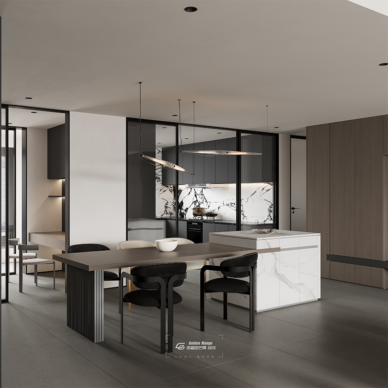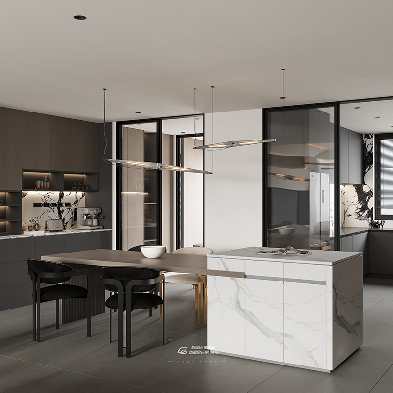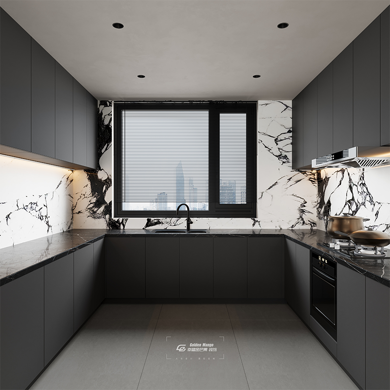 黑灰櫥柜筑就利落秩序,大理石墻似水墨潑灑肆意。嵌入燈帶暈開柔芒,百葉窗濾進城市微光。冷峻材質(zhì)與流動紋理碰撞,在這方餐廚場域,把煙火日常暈染成高級詩意 。