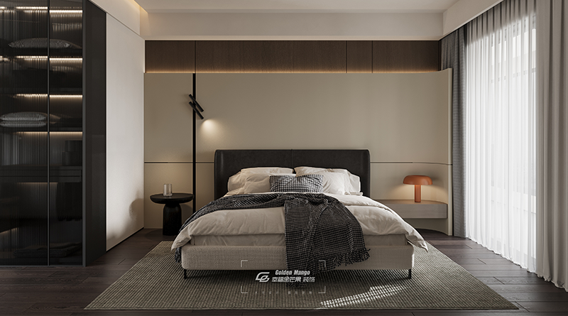 暖棕與深黑勾勒睡眠場域,線性燈暈漫過床頭柔化邊界。玻璃衣柜藏起秩序,不對稱燈盞灑落清輝,格紋毯添幾分松弛。紗簾濾進微光里,每道線條都在訴說:喧囂外,獨屬休憩的靜謐詩行 。