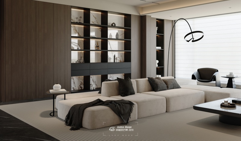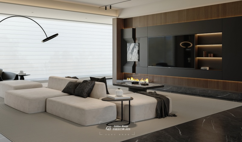 踏入客廳,便被其通透開闊的格局所震撼。墻面以黑、白、木三色為主基調(diào),通過簡潔的線條與色塊劃分,勾勒出極具現(xiàn)代感的視覺效果。