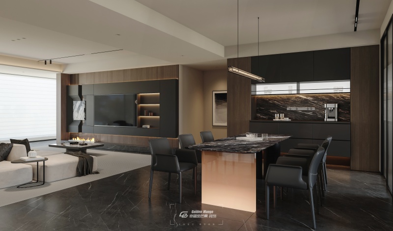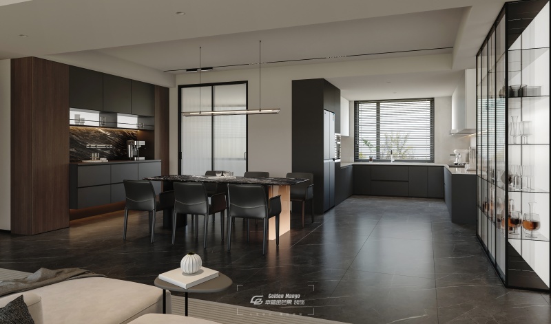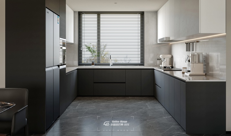 廚房區(qū)域以簡約而實用的設(shè)計為特點。整體櫥柜采用深色系搭配黑色大理石臺面,營造出一種低調(diào)奢華的氛圍。