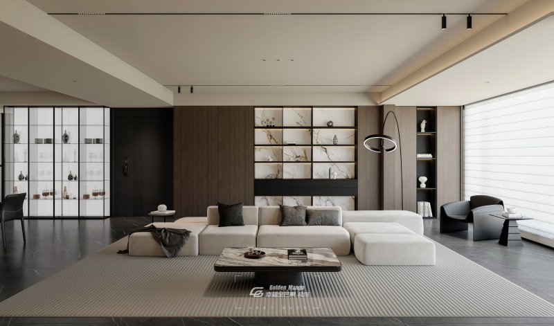 黑色地磚與灰色地毯的搭配,低調(diào)中透著奢華,而淺色沙發(fā)搭配不規(guī)則大理石茶幾,圍合出一個溫馨而時尚的交流空間。落地窗引入充足自然光,光影交織間,讓整個空間充滿生機與活力。