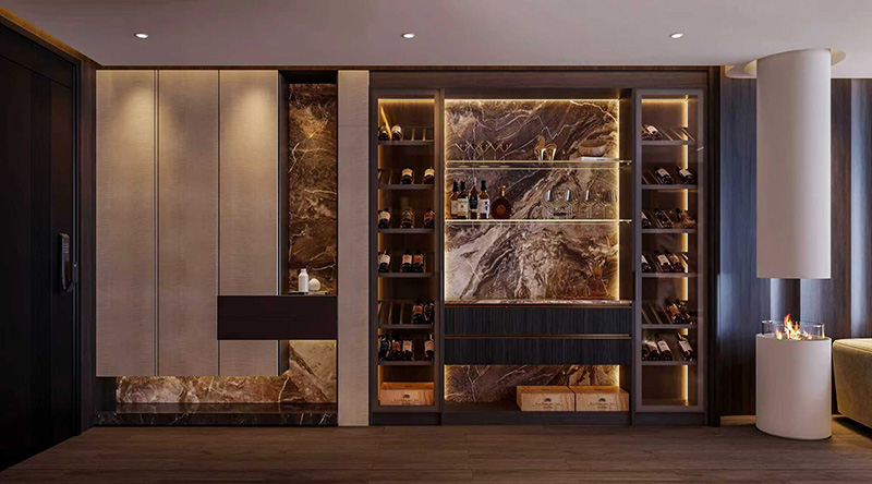 靜奢風(fēng)格的靈魂在于材質(zhì)的純粹表達(dá)。畫面中央,不規(guī)則大理石紋理的背景墻如山水畫卷般鋪展,深棕與米白的自然肌理在嵌入式暖光的映照下,呈現(xiàn)出玉石般的溫潤(rùn)光澤。與之形成材質(zhì)對(duì)話的是深色胡桃木酒柜,豎條紋的木飾面通過精密的拼接工藝,在視覺上延伸了空間高度,內(nèi)置的感應(yīng)式層板燈將珍藏的酒品輪廓勾勒得如同藝術(shù)展品。