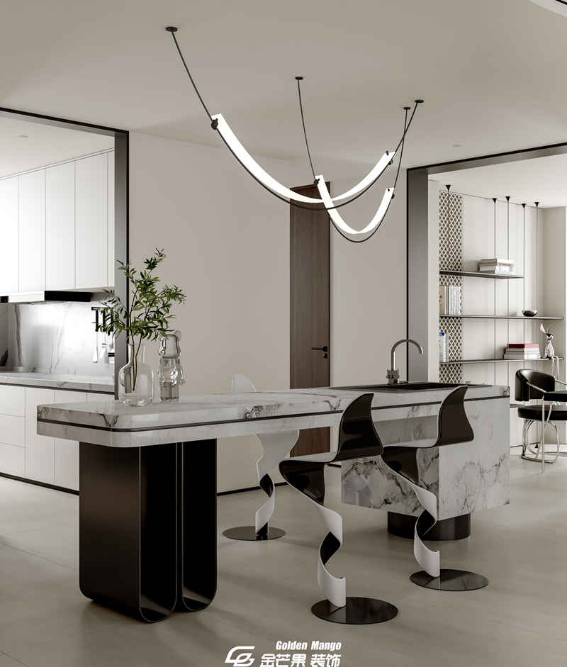 n 從客廳步入餐廳,視野豁然開朗。金芒果的設計師將餐廳與廚房打通,用一個中島臺作為自然過渡,既增強了家人間的互動,又讓空間顯得更加通透。餐桌的選擇堪稱點睛之筆—— 一張長度 2.2 米的巖板餐桌,搭配 6 把淺灰色皮質餐椅,簡約中透著高級感。餐桌上方懸掛著一盞造型獨特的吊燈,黑色金屬框架搭配白色燈罩,燈光灑下時,給食物鍍上了一層溫柔的濾鏡。