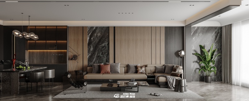 空間布局開闊流暢,沙發、茶幾等家具擺放規整,營造出舒適有序的氛圍 。墻面運用木質、石材等天然材質,搭配簡約的燈光設計,凸顯出意式極簡風格的優雅與質感,同時綠植點綴增添生機,讓整個空間兼具時尚與自然韻味 。