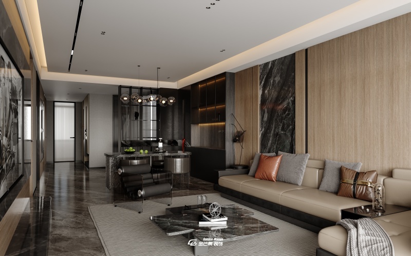 淺灰、木色、深灰為主色調,地面通鋪大理石紋理地磚,延伸空間感,上方線性燈光與球形吊燈呼應,展現出意式極簡 “少即是多” 的美學,讓空間既顯開闊又充滿細節。