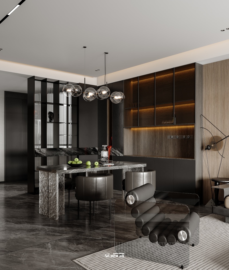 餐廚區以深色木質高柜為背景,搭配內嵌式暖光燈帶,營造出沉穩內斂的氛圍。