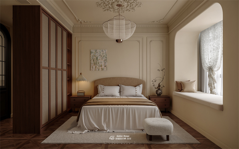 柔和米色為主調,雕花吊頂、石膏線護墻勾勒優雅輪廓。木質百葉衣柜兼具收納與美觀,復古吊燈、藝術掛畫增添氛圍,窗邊打造愜意飄窗,床品、家具選品溫潤,整體營造出浪漫經典又舒適靜謐的休憩環境 。