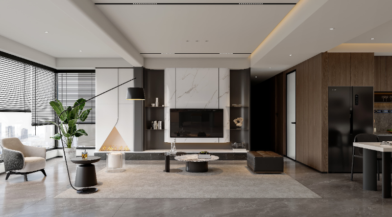 淺灰大理石地磚配同色系地毯,延伸空間感。右側木飾面與深色家電銜接餐廳,整體通過材質拼接、色彩協(xié)調,打造出精致舒適、契合當下審美趨勢的居住空間 。