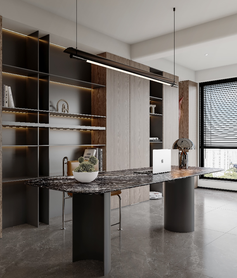家具陳設:房間中央擺放著一張造型獨特的書桌,桌面采用大理石材質,紋理自然,質感高級;桌腿則是深色柱狀設計,與桌面形成對比。