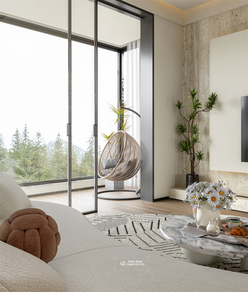推開門,客廳的通透感瞬間攫住視線:超大全景推拉門如 “取景框”,將窗外綠意溫柔納入室內,晴日里,陽光漫過地板,連空氣都泛著暖調。