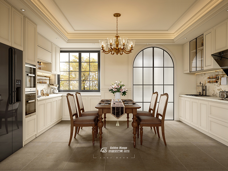 廚房中,先進的電器與豐富的調料架整齊排列,隨時準備迎接一場烹飪之旅。餐桌上方的水晶吊燈如同繁星垂落,照亮了家人相聚時的歡聲笑語。