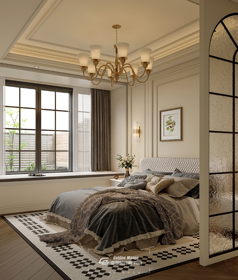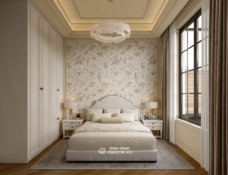 臥室是疲憊心靈的溫柔歸宿。柔和的燈光映照在床頭背景的花鳥壁紙上,勾勒出一片寧靜的棲息天地。