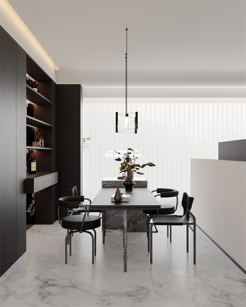 餐廳區(qū)域,黑色金屬質(zhì)感的餐桌搭配設(shè)計感餐椅,與上方幾何吊燈形成材質(zhì)與形態(tài)的呼應(yīng)。一側(cè)的意式酒柜以黑色為基底,內(nèi)嵌大理石紋理背板,在燈光烘托下成為收藏美酒與展示藝術(shù)的 “生活博物館”。
