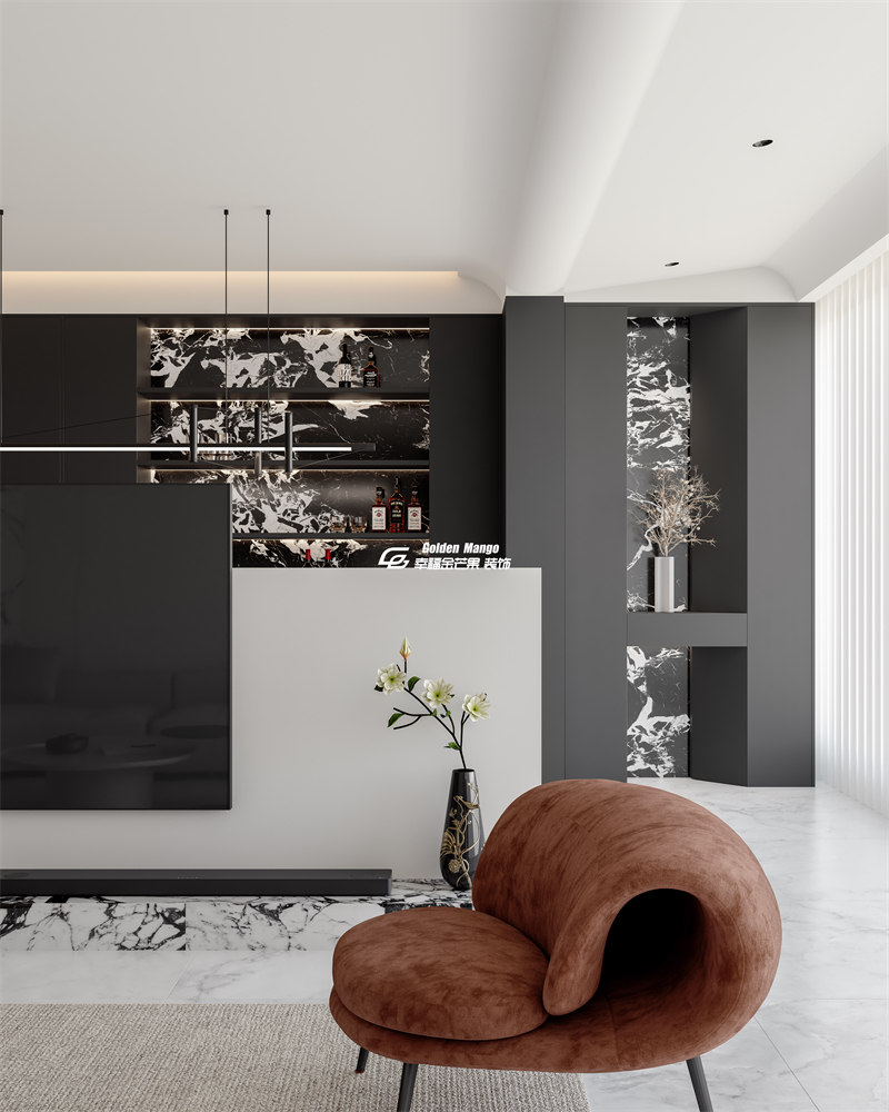 客廳以黑白灰構(gòu)建極簡框架,卻在細節(jié)處暗藏奢雅心機。弧形米白色沙發(fā)柔化空間棱角,搭配焦糖色意式單人椅,在中性色調(diào)中注入溫暖層次。墻面的黑白大理石藝術(shù)裝置與電視背景的極簡設(shè)計形成對比,金屬線條吊燈的幾何感則呼應(yīng)了意式設(shè)計的理性美學(xué)。