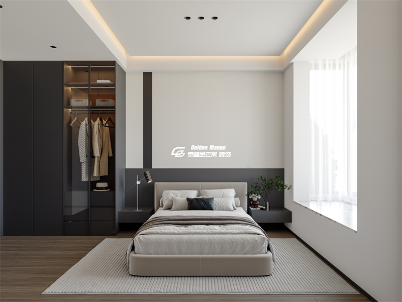 主臥延續(xù)整體風(fēng)格的克制與優(yōu)雅,米白色軟包床具搭配灰色系背景墻,在木質(zhì)地板與針織地毯的溫暖質(zhì)感中,構(gòu)建出松弛的休憩氛圍。