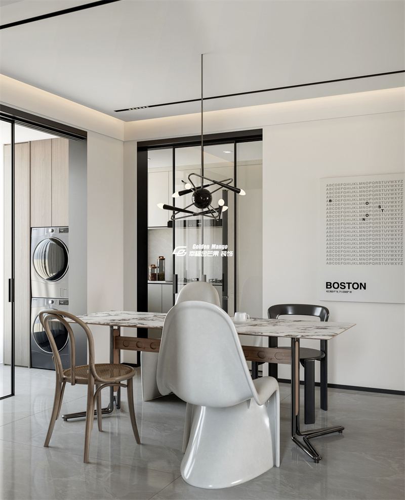 ** dining area**:大理石紋理的餐桌簡約大氣,搭配造型獨(dú)特的白色餐椅與經(jīng)典木椅,在統(tǒng)一中制造細(xì)節(jié)反差;極具藝術(shù)感的吊燈如 “分子結(jié)構(gòu)” 般懸于上方,為用餐時(shí)光增添幾分摩登氣息。
