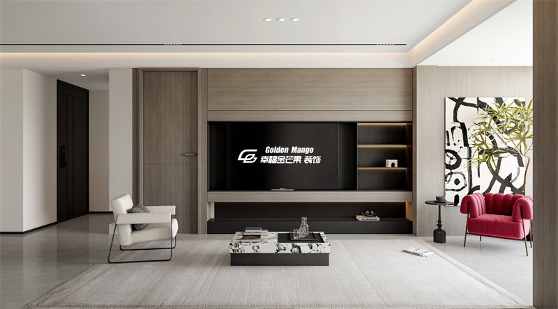 細(xì)節(jié)巧思:電視背景墻的木飾面與黑色收納格形成對(duì)比,暗藏的燈帶為擺件鍍上一層柔光;角落那抹紅色單人椅,是空間的點(diǎn)睛之筆,在理性的極簡中跳脫出一抹熱烈的生活情緒。