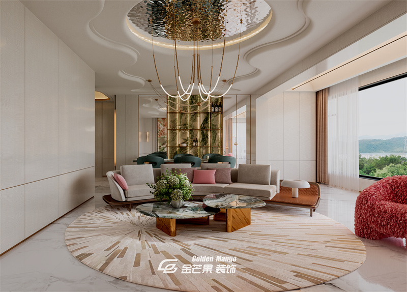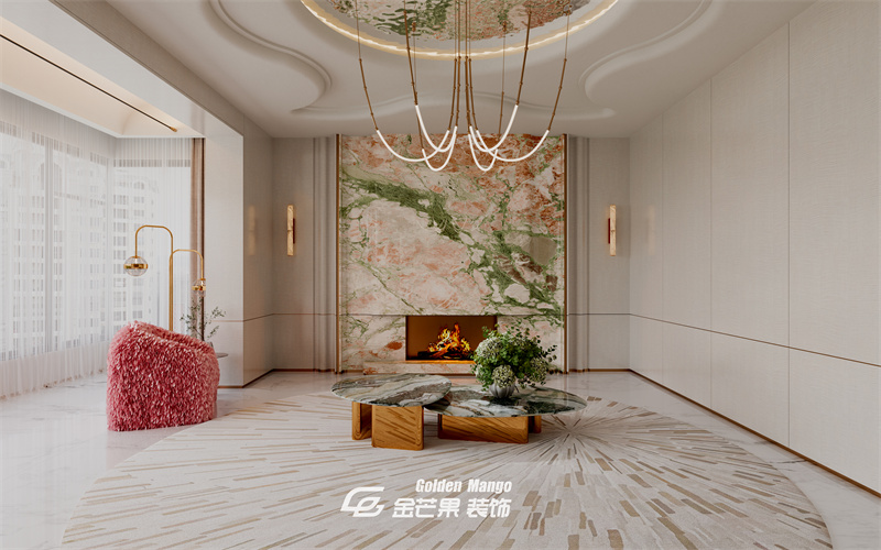 淺灰沙發(fā) + 粉色抱枕 + 毛絨單椅,柔和色調(diào)里藏著俏皮,圓形地毯的放射紋與吊頂呼應(yīng),讓空間更靈動(dòng)。