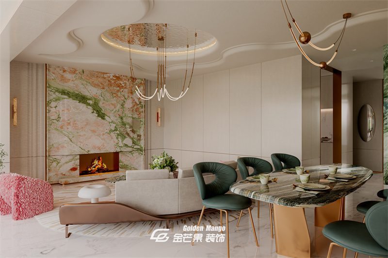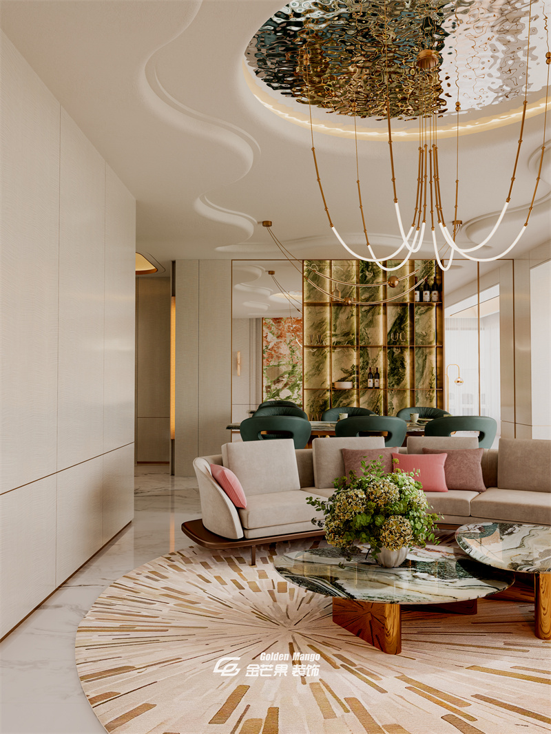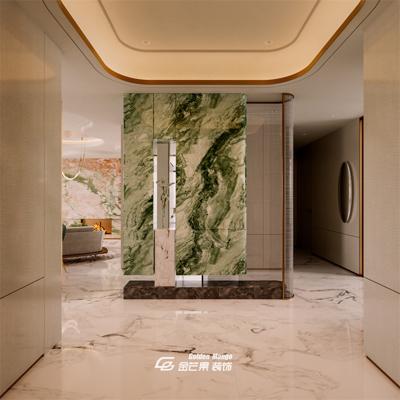 用祖母綠奢石做隔斷背景,紋理流動(dòng)如山水畫卷,搭配懸浮石質(zhì)擺件,自帶藝術(shù)氣場(chǎng);頂部弧形吊頂 + 金色收邊,柔和了空間棱角,與地面的白紋大理石呼應(yīng),一進(jìn)門就把輕奢格調(diào)拉滿。