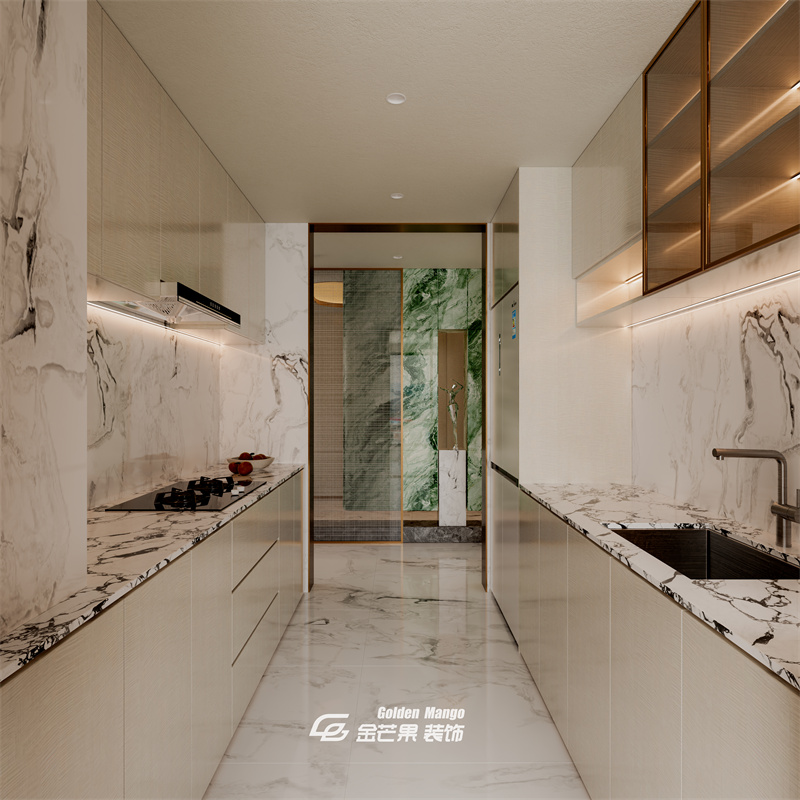 墻面、臺(tái)面統(tǒng)一用白紋大理石,干凈通透;無(wú)拉手櫥柜 + 嵌入式家電,視覺(jué)更整潔。