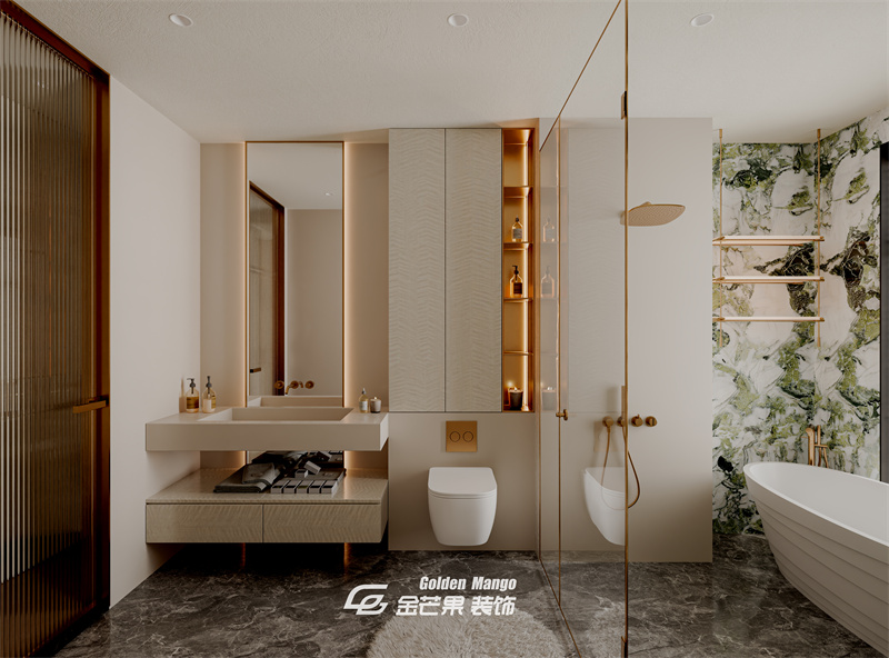 墻面局部用祖母綠奢石呼應(yīng)玄關(guān),金色金屬件(置物架、龍頭)做點(diǎn)綴,冷調(diào)材質(zhì)里藏著精致;浴缸靠窗擺放,泡澡時(shí)也能享窗外景,儀式感拉滿。