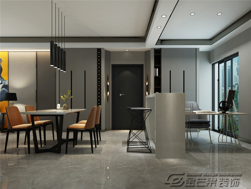 整個空間采用大量的灰色系元素,極簡的樣式與深沉凝練的紋理,大氣而干練讓空間充滿著高度成熟而內蘊的意趣。設計師考慮到客餐廳比較寬闊,在原餐廳處增設輕食吧臺,為餐廳空間營造了不同的生活情趣。