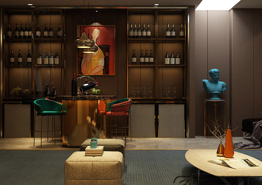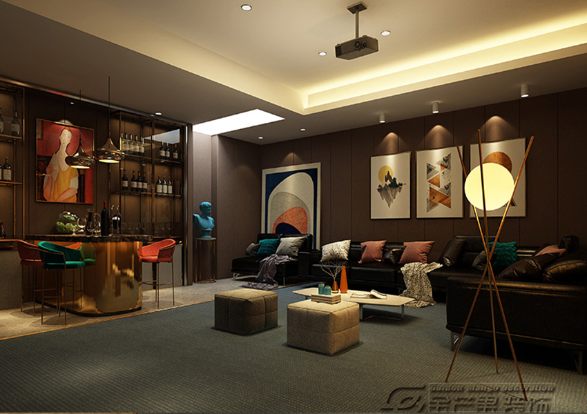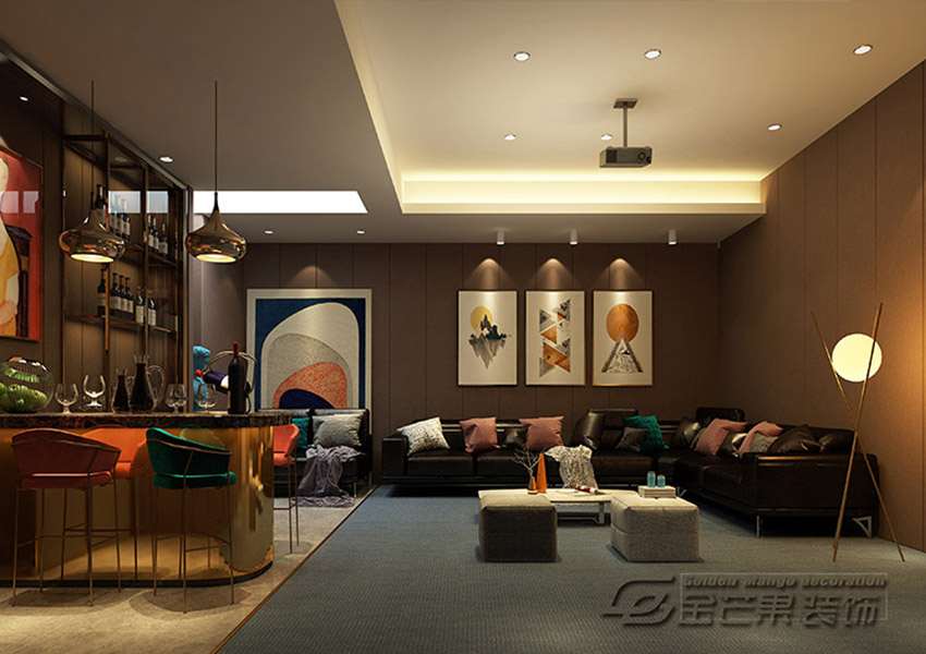打造頂級的影院級,專屬空間。休閑沙發,是長時間觀影的一大保障。酒柜里的紅酒也是情到深處的催化劑。抽象色彩的壁畫、雕塑也是對精神生活追求的表現。
