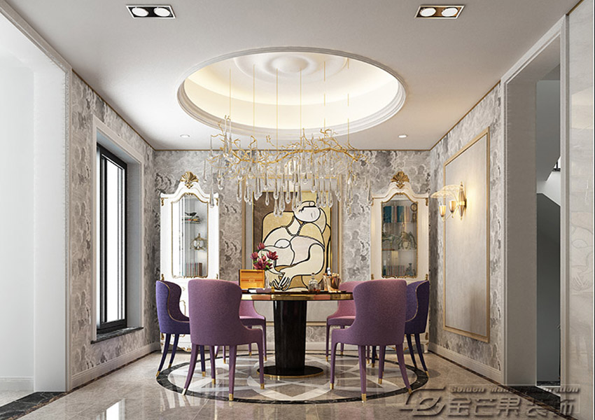 玲瓏剔透的水晶吊燈映入眼簾,紫色的凳子點綴著餐廳。地板圓形圖案、圓形餐桌、圓形的吊頂,更能彰顯團團圓圓之意,相互呼應。壁畫也讓人充滿無限的想象。壁紙則是多了些許的內斂。