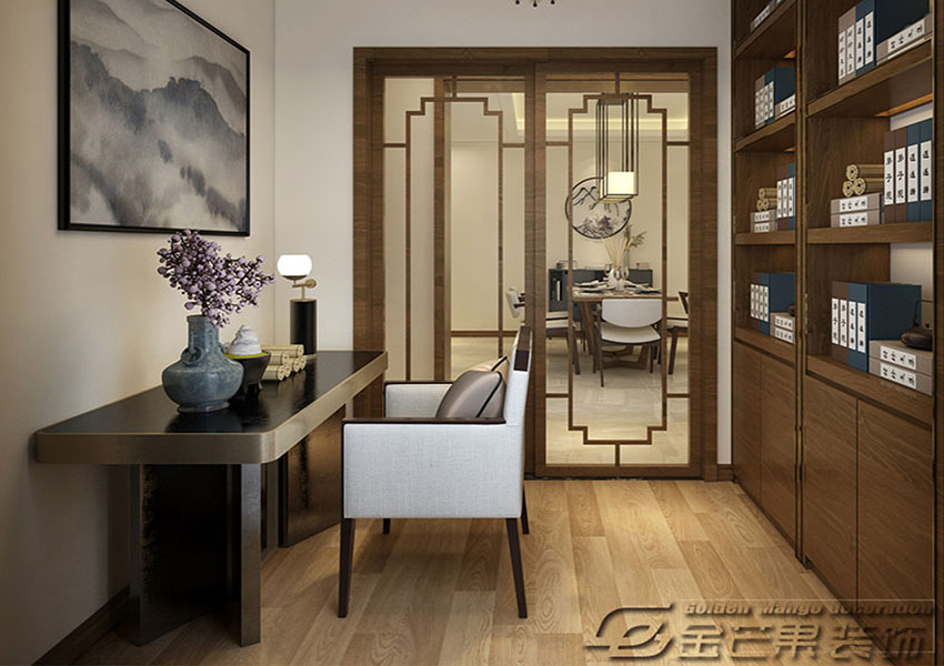 木質的地板和紅木色的書柜交相呼應,書柜上的竹卷、書籍是對文化歷史傳承,門帶著中式元素。