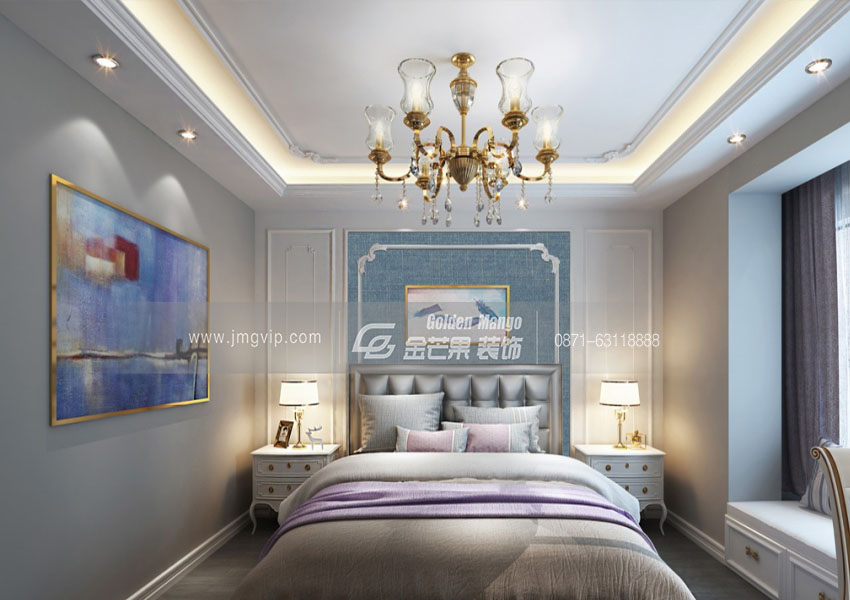 精美的吊燈和雕花,金黃色的燈光照射在乳白色的墻面上,更顯高貴。舒適飽滿的床,滿載沉沉的睡意。精美的儲物柜,讓房間更加干凈、整潔。