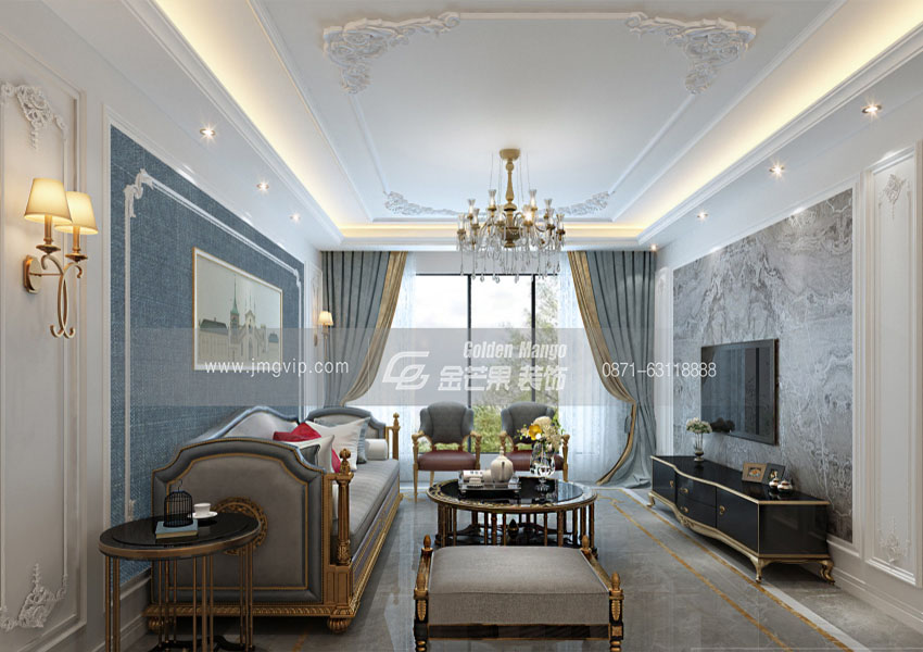 設計布局上沒有絲毫的掩飾,不論是大方的落地窗簾,還是頂上精美的雕花,亦或是晶瑩碧透的地磚等等,都在流露著豪華和優(yōu)雅。背景墻也和窗簾交相呼應。雕刻精細的沙發(fā)和椅子,高貴典雅。