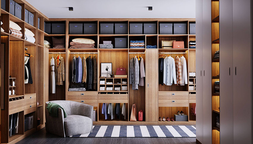 站在省錢的角度上說話,自己隔出來一個更衣室比定做衣櫥省錢。可以用布紗代替衣櫥門片(賣場衣柜門價格不菲),用布簾區(qū)隔出更衣室。衣柜最花錢的部分還有五金,多用收納盒,可以減少五金的使用量。