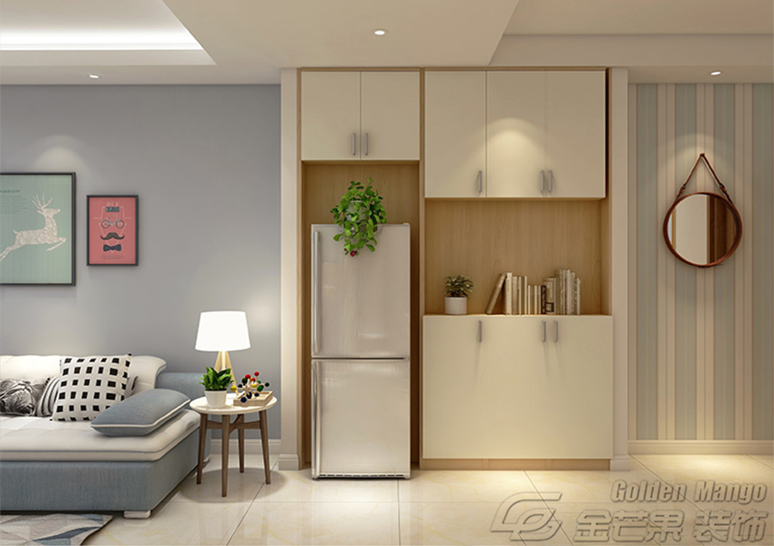 在空間的收納上面,設計師也足夠用心,時常飲用的飲品在冰箱可以安心的沉睡,靜待喚醒。柜體上的書籍是主人閑情雅致的體現。